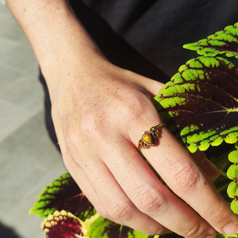 Es un anillo ajustable con ojo de tigre natural y diseño alado. Una pieza con carácter y significado, que combina fuerza, claridad y conexión con la tierra.