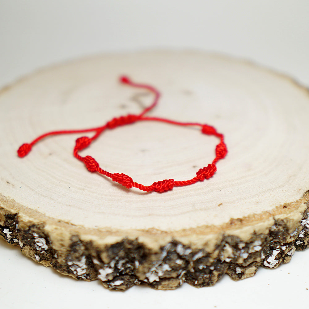 Una pulsera de hilo rojo con siete nudos, inspirada en tradiciones populares y pensada como amuleto simbólico y cultural.